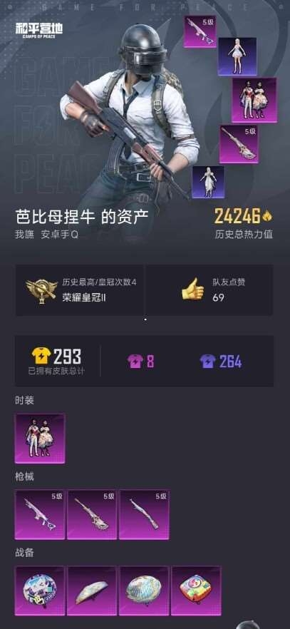 安卓【精品小号/3粉装-6特效枪】手Q-23398热力值-2印记-51套装-76枪皮 【特效枪等级】:GROZA-镜光银凌(五级),AUG-暖羊咩咩(五级),P90-冷漠罗丽(五级),Kar98K-巳巳如意(五级),MG3-辉羽雀灵(五级MG-36-幻彩电音)