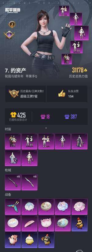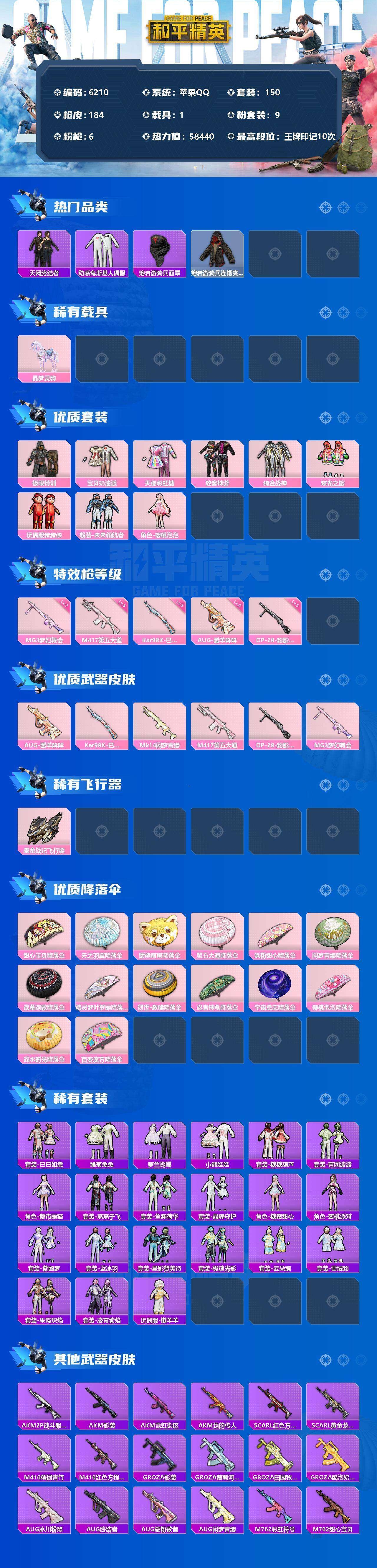苹果【精品小号/7粉装-2满特效枪-1粉色飞行器】手Q--31178热力值-2王牌印记-74套装-109枪皮 【粉色套装】:粉装-蝶舞迷情,粉装-冰川幽秘,粉装-冰川红玫,角色-千金淑猫,角色-宁雨蝶,角色-天穹,角色-荧海星豚 【粉色枪皮等级】:Kar98K