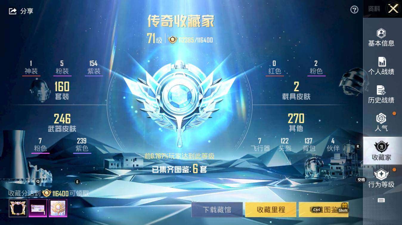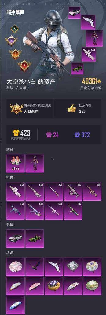 安卓【精品小号/梦幻火箭/初号机款机体服/暗影哥特/赤蝎幽灵/胖达圆圆/3粉装-5满特效枪-1载具】手Q--36873热力值-6印记-94套装-118枪皮 【稀有载具】:星河领航(磐石银) 【特效枪等级】:AKM-绿萝繁花(五级),SCAR-L-锦绣绵绵(五级