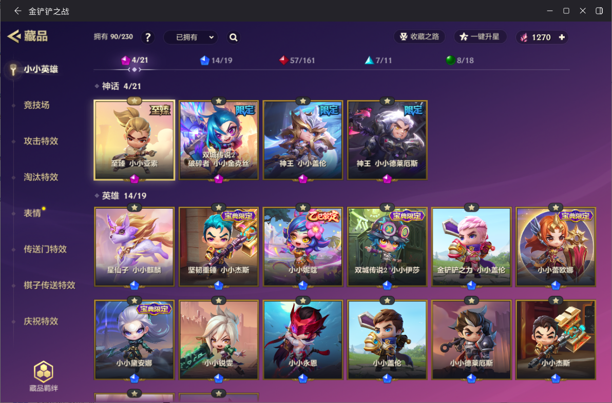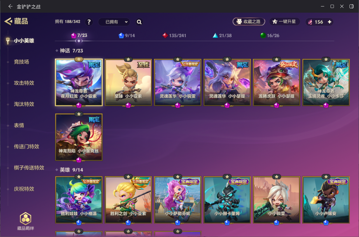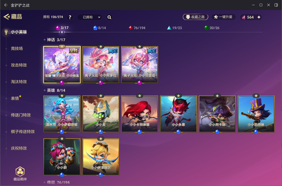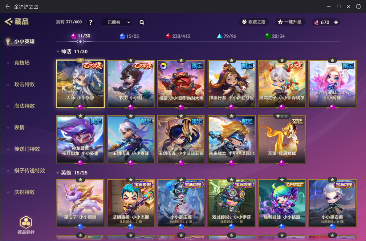 ID:JCCZZ0965】【金铲铲之战】0神话小小英雄-0神话竞技场-11小小英雄-1竞技场-6攻击特效 【限定小小英雄】:小小金克丝,小小索拉卡 【传说小小英雄】:歌姬 夜月兔 【史诗小小英雄】:仙灵 软软,暗夜巫师 怒角 【神话小小英雄】:至臻 离子火花 小小格温