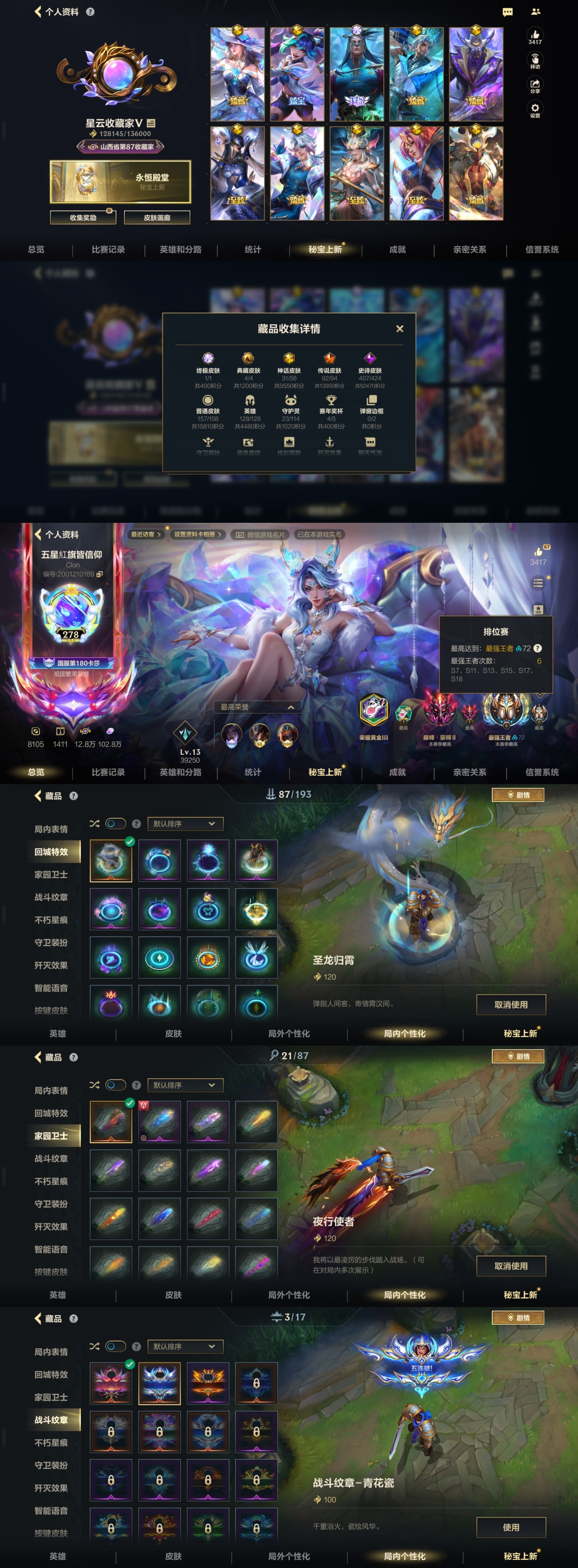 安卓V,可转区!金名号!13.5万收藏积分!终极永恩,4典藏,47神话!新水晶皮肤全部拉满!673皮肤!白龙回城!青花瓷播报!玄都播报!顶级拖尾!点卷一千多!ID一个字,醉!各种新皮肤套装拉满!