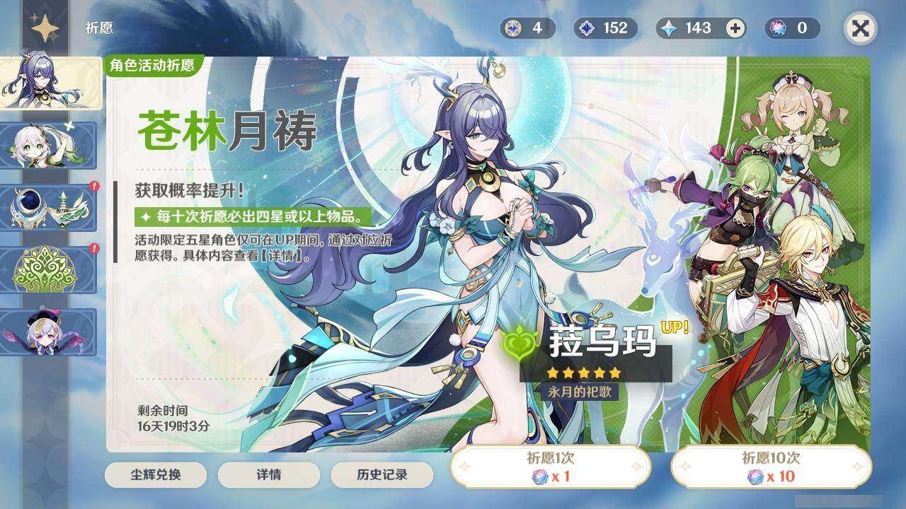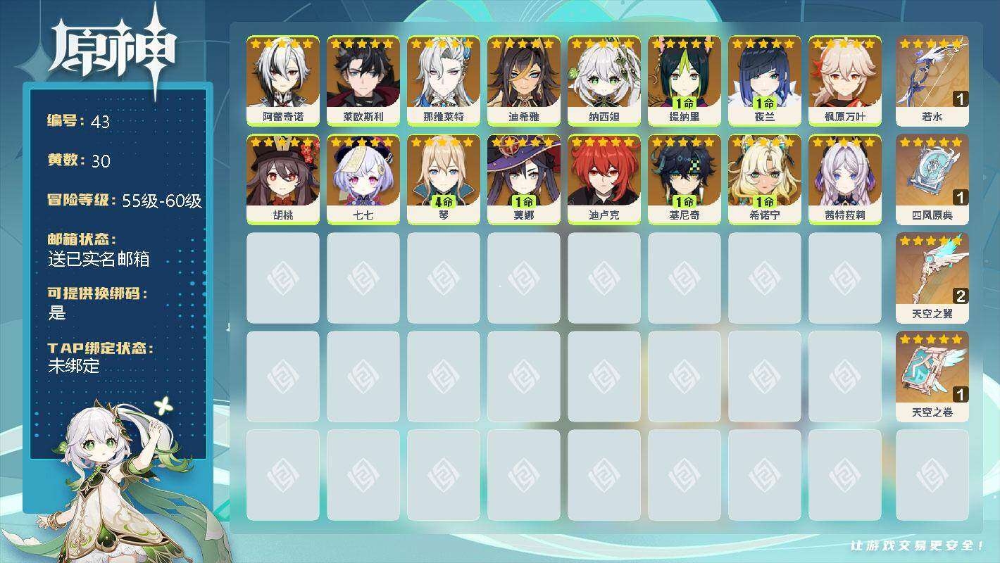 55级/10黄/女主/8个五星角色/1个五星武器 0命流浪者,0命纳西妲,1命提纳里,0命神里绫华,0命钟离,0命可莉,0命刻晴,0命莫娜,精1天空之翼