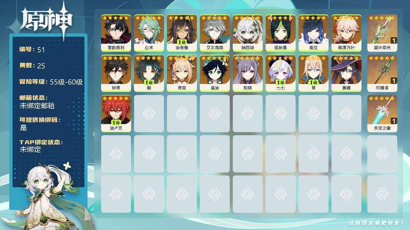 60级/51黄/女主/20个五星角色/11个五星武器 0命纳西妲,0命夜兰,0命申鹤,0命优菈,2命雷电将军,0命神里绫华,1命钟离,1命胡桃,0命甘雨,0命魈,1命温迪,0命可莉,0命达达利亚,0命珊瑚宫心海,2命刻晴,2命七七,满命琴,0命莫娜,3命迪卢克,0命丝柯克,精1终末嗟叹之诗,