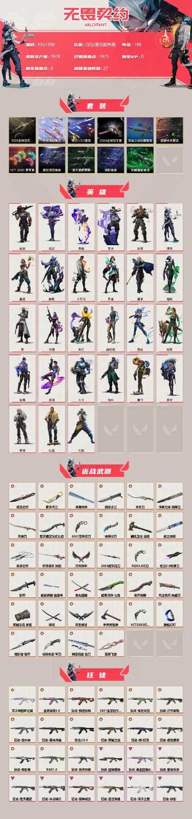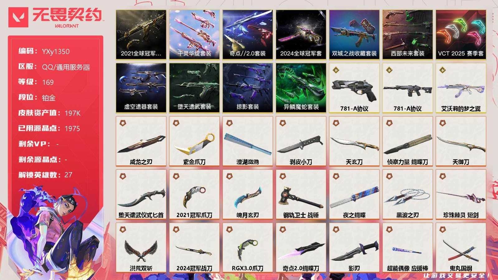 官方认证19.7w库存21冠军套.24冠军套.莲花套.蛇年套.双城套】YXy1350【可二次】 【套装】:2024全球冠军赛套装,2021全球冠军赛套装,虚空遗器套装,VCT 2025 赛季套装,西部未来套装,《双城之战》收藏套装,千灵华绽套装,奇点//2.0套装,异鳞魔蛇套装,掠影套装,堕天遗武套装 【英雄】:幻棱,炼狱,维斯,暮蝶,钛狐,壹决,铁臂,捷风,雷兹,幽影,不死鸟,贤者,猎枭,蝰蛇,零,芮娜,奇乐,尚勃勒,霓虹,斯凯,夜露,星礈,K/O,海神,盖可,黑梦,钢锁 【近战 武器】